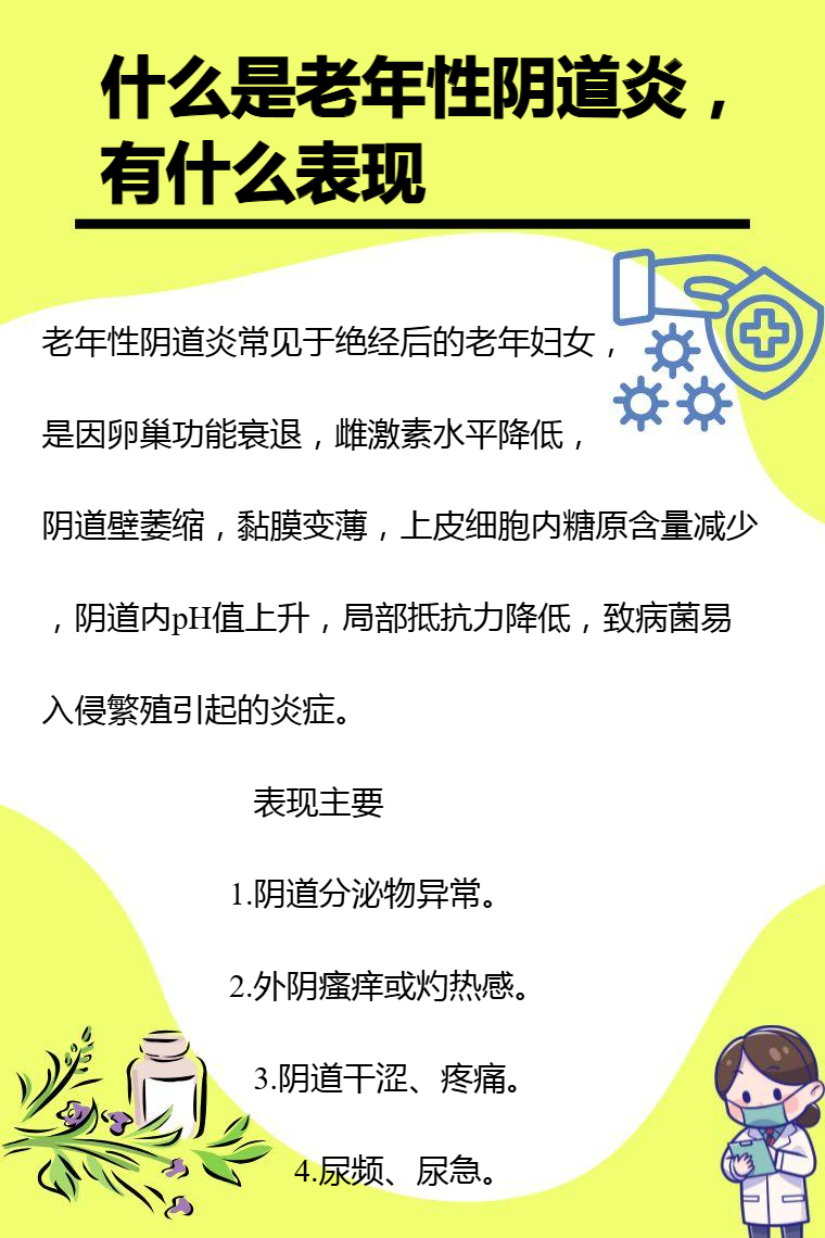 老年性阴道炎常见于绝经后的老年妇女,是因卵巢功能衰退,雌激素水平降低,阴道壁萎缩,黏膜变薄,上皮细胞内糖原含量减少,阴道内pH值上升,局部抵抗力降低,致病菌易入侵繁殖引起的炎症。